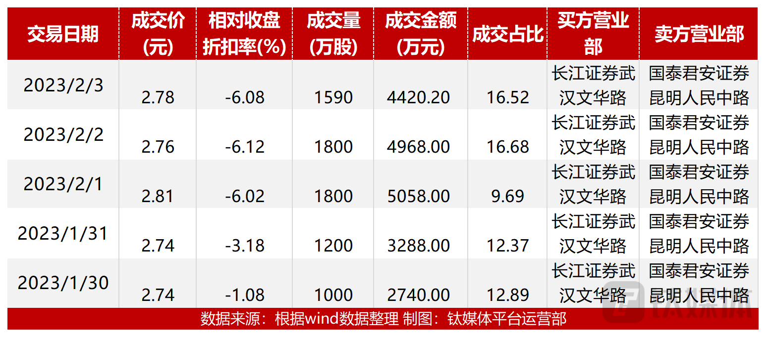 此外,鹏都农牧在上周发生5笔大宗交易,合计成交金额约2.05亿元。其中1月30日成交价为2.74元/股,较收盘价折价1.08%,成交1000万股,成交额2740万元;1月31日成交价为2.74元/股,较收盘价折价3.18%,成交1200万股,成交额3288万元;2月1日成交价为2.81元/股,较收盘价折价6.02%,成交1800万股,成交额为5058万元;2月2日成交价为2.76元/股,较收盘价折价6.12%,成交1800万股,成交额为4968万元;2月3日成交价为2.78元/股,较收盘价折价6.08%,成交1590万股,成交额为4420.2万元。