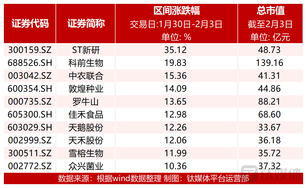 此外,涨幅前十位的个股还包括,科前生物(688526.SH)上涨19.83 %,市值为139.16亿元;中农联合(003042.SZ)上涨15.36 %,市值为41.31亿元;敦煌种业(600354.SH)上涨14.09 %,市值为44.86亿元;罗牛山(000735.SZ)上涨13.65 %,市值为88.21亿元;佳禾食品(605300.SH)上涨12.98 %,市值为68.60亿元;天鹅股份(603029.SH)上涨12.26 %,市值为33.67亿元;天禾股份(002999.SZ)上涨12.06 %,市值为36.18亿元;雪榕生物(300511.SZ)上涨11.99 %,市值为35.72亿元;众兴菌业(002772.SZ)上涨10.36 %,市值为37.32亿元。