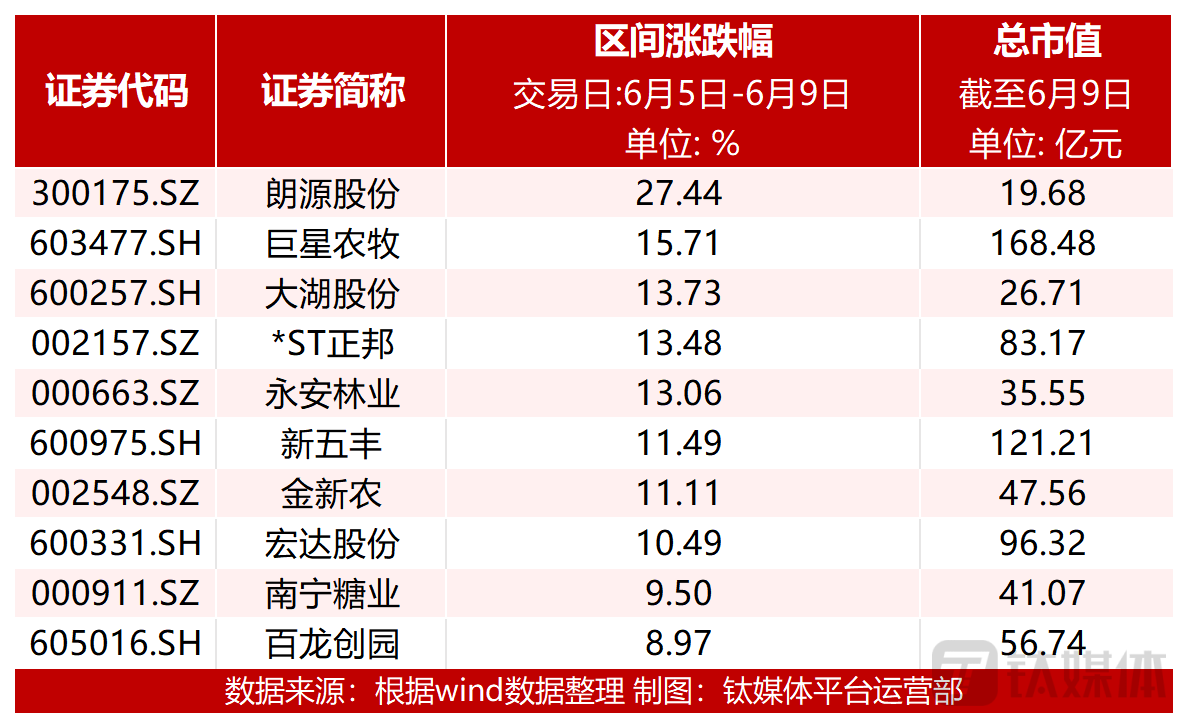 朗源股份(300175.SZ)上涨27.44%,市值19.68亿元;巨星农牧(603477.SH)上涨15.71%,市值168.48亿元;大湖股份(600257.SH)上涨13.73%,市值26.71亿。