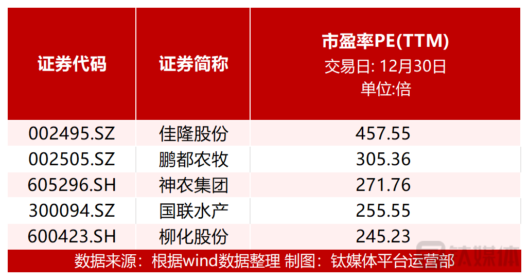 佳隆股份(002495.SZ)457.55倍、鹏都农牧(002505.SZ)305.36倍、神农集团(605296.SH)271.76倍、国联水产(300094.SZ)255.55倍、柳化股份(600423.SH)245.23倍。