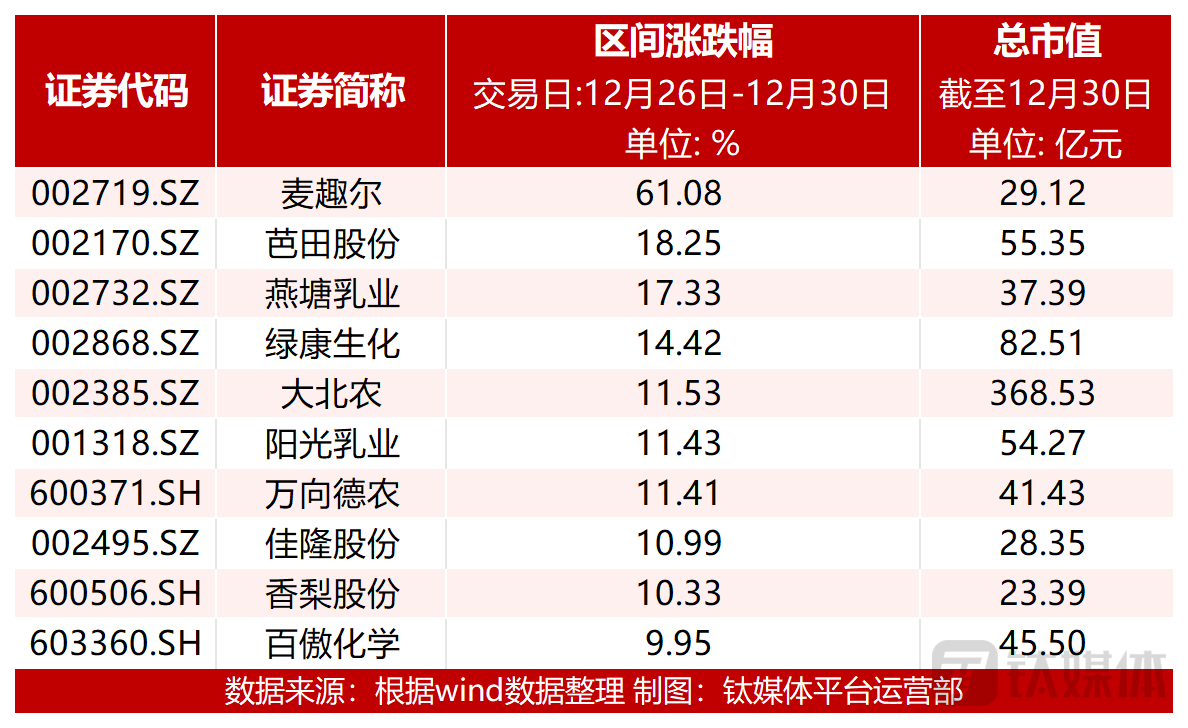 其中麦趣尔(002719.SZ)暴涨61.08%。此外,涨幅前十位的个股还包括,芭田股份(002170.SZ)上涨18.25 %,市值为55.35亿元;燕塘乳业(002732.SZ)上涨17.33 %,市值为37.39亿元;绿康生化(002868.SZ)上涨14.42%,市值为82.51亿元;大北农(002385.SZ)上涨11.53%,市值为368.53亿元;阳光乳业(001318.SZ)上涨11.43%,市值为54.27亿元;万向德农(600371.SH)上涨11.41%,市值为41.43亿元;佳隆股份(002495.SZ)上涨10.99%,市值为28.35亿元;香梨股份(600506.SH)上涨10.33%,市值为23.39亿元;百傲化学(603360.SH)上涨9.95%,市值为45.50亿元。