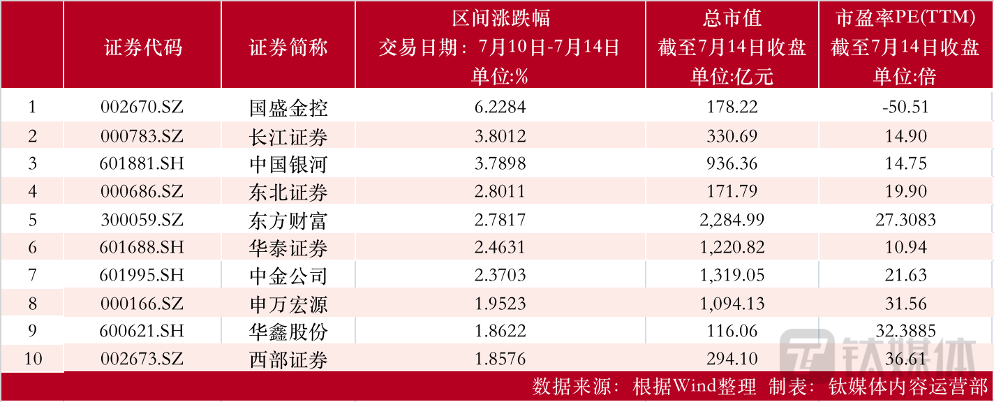 截至7月14日收盘,中信证券、东方财富和中信建投位列证券行业市值前三,市值分别为2845.15亿元、2284.99亿元和1688.98亿元。市盈率前三为中原证券、华林证券和首创证券,分别为110.04倍、95.11倍和59.29倍。