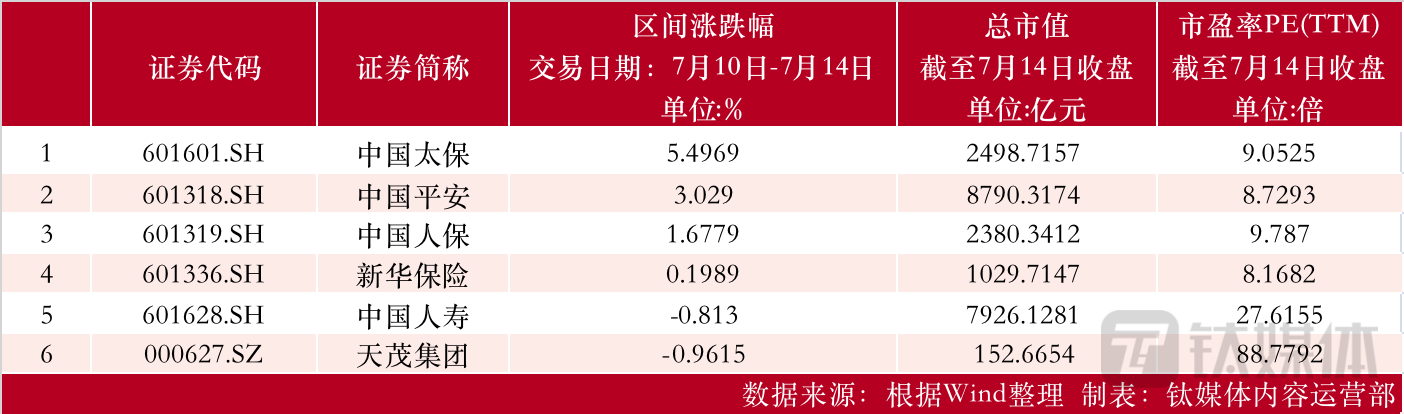 截至7月14日收盘,中国平安、中国人寿和中国太保位列保险行业市值前三,市值分别为8790.31亿元、7926.12亿元和2498.71亿元。市盈率前三为天茂集团、中国人寿和中国人保,分别为88.77倍、27.61倍和9.78倍。