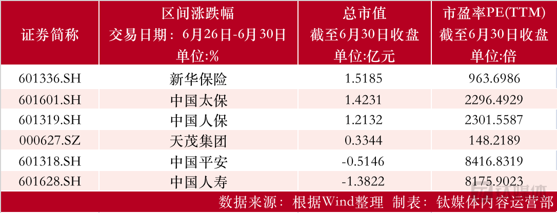 截至6月30日收盘,中国平安、中国人寿和中国人保位列保险行业市值前三,市值分别为8416.83亿元、8175.90亿元和2301.55亿元。市盈率前三为天茂集团、中国人寿和中国人保,分别为86.19倍、28.40倍和9.43倍。