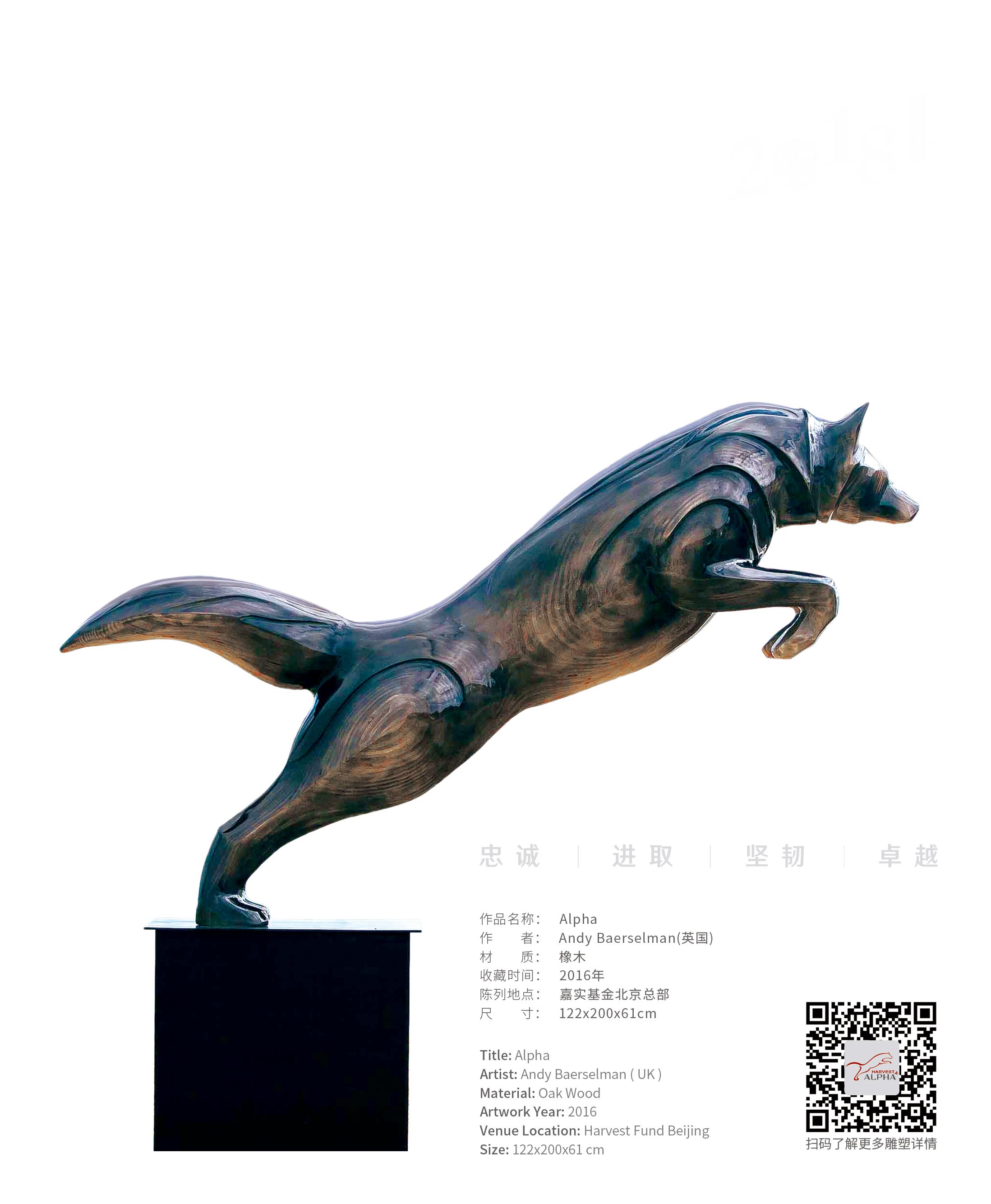 Alpha是由英国著名艺术家安迪·贝斯曼创作的雕塑艺术品。艺术家通过艺术手法,将狼与狗这两种动物身上优秀的品质、精神进行完美结合,具有独特的艺术魅力。
