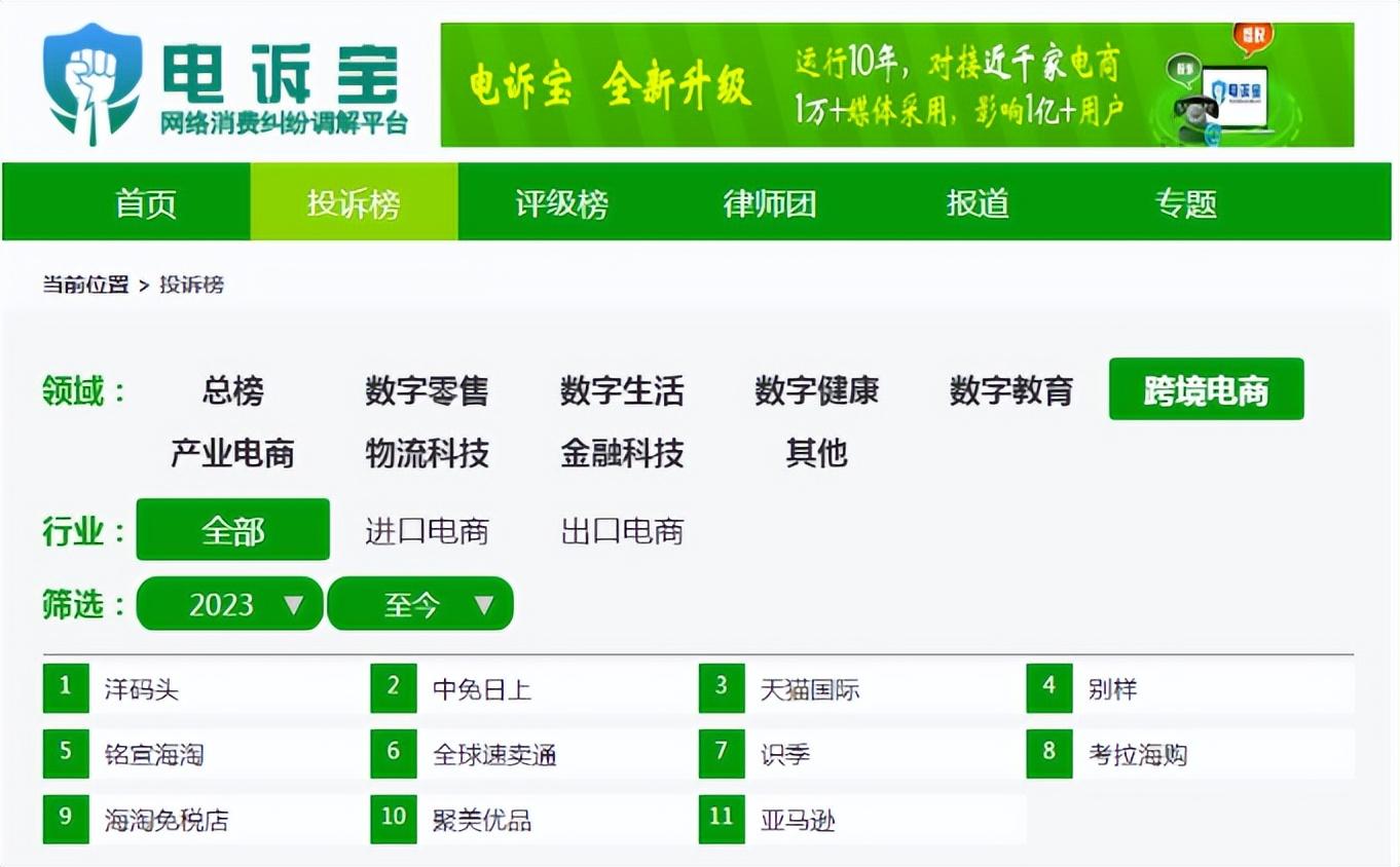 据国内知名网络消费纠纷调解平台“电诉宝”(315.100EC.CN)数据显示,2023年至今跨境电商领域的投诉事件按投诉量排序依次为:洋码头、中免日上、天猫国际、别样、铭宣海淘、全球速卖通、识季、考拉海购、海淘免税店、聚美优品、亚马逊。此前,也曾收到过熊猫生活、海带宝、敦煌网、冰冰购、剁手帮、德国BA保镖商城、海狐海淘、海豚家、行云货仓等类似平台投诉。