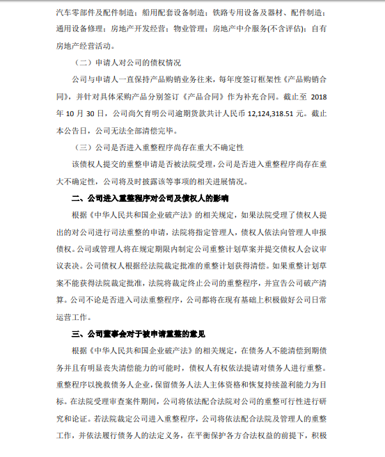 公司与申请人一直保持产品购销业务往来,每年度签订框架性《产品购销合同》,并针对具体采购产品分别签订《产品合同》作为补充合同。截止至 2018 年 10 月 30 日,公司尚欠育明公司逾期货款共计人民币 12,124,318.51 元。截止 本公告日,公司无法全部清偿完毕。