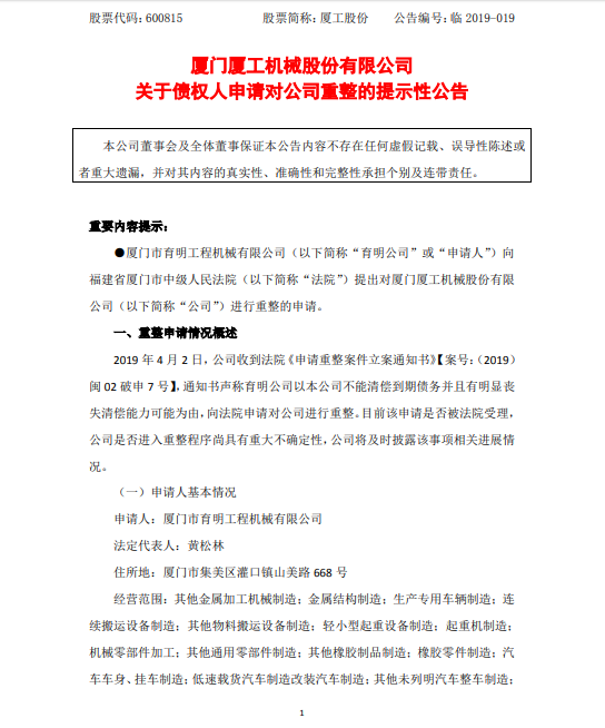 据厦工股份的公告,2019 年 4 月 2 日,公司收到法院《申请重整案件立案通知书》,通知书声称育明公司以本公司不能清偿到期债务并且有明显丧 失清偿能力可能为由,向法院申请对公司进行重整。目前该申请是否被法院受理, 公司是否进入重整程序尚具有重大不确定性。