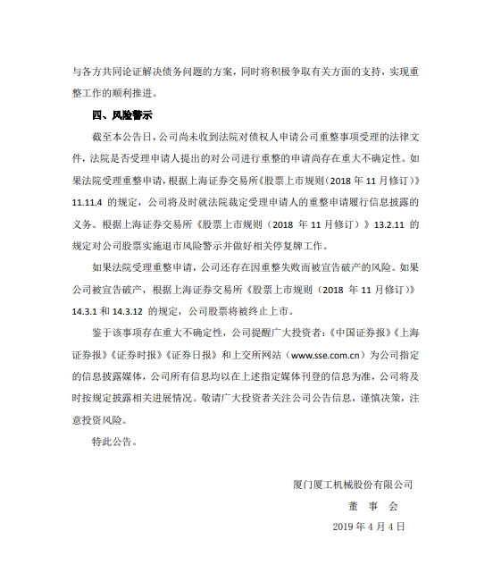 厦工股份同时进行了风险警示,如果法院受理重整申请,公司还存在因重整失败而被宣告破产的风险。如果公司被宣告破产,根据上海证券交易所《股票上市规则(2018 年 11 月修订)》 14.3.1 和 14.3.12 的规定,公司股票将被终止上市。