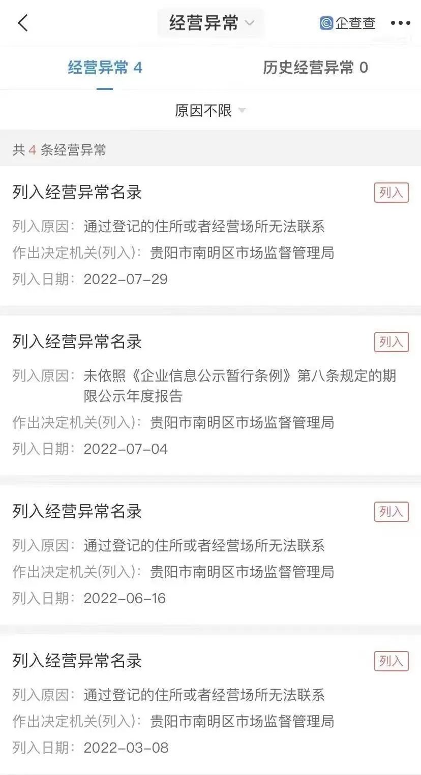 ↑贵州钵恒庆余科技公司有多项经营异常记录
