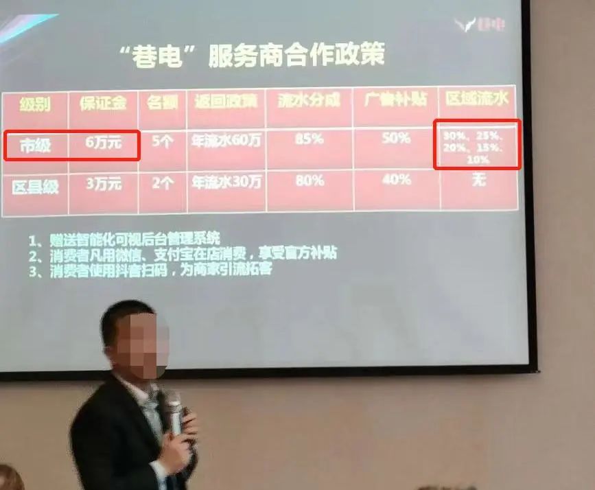↑会议现场宣讲人员承诺第一名市级代理可获得全市30%收益分成
